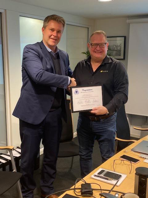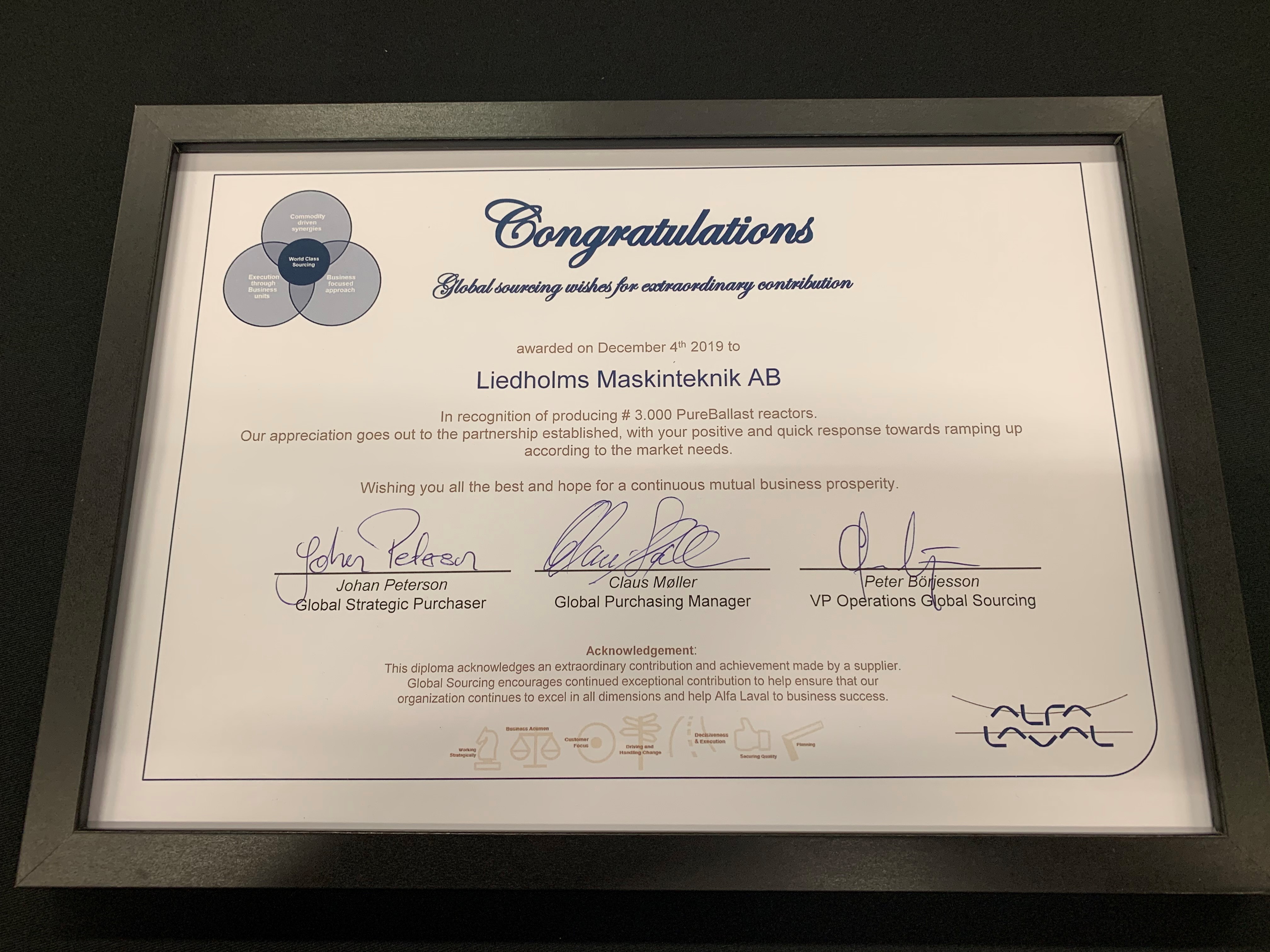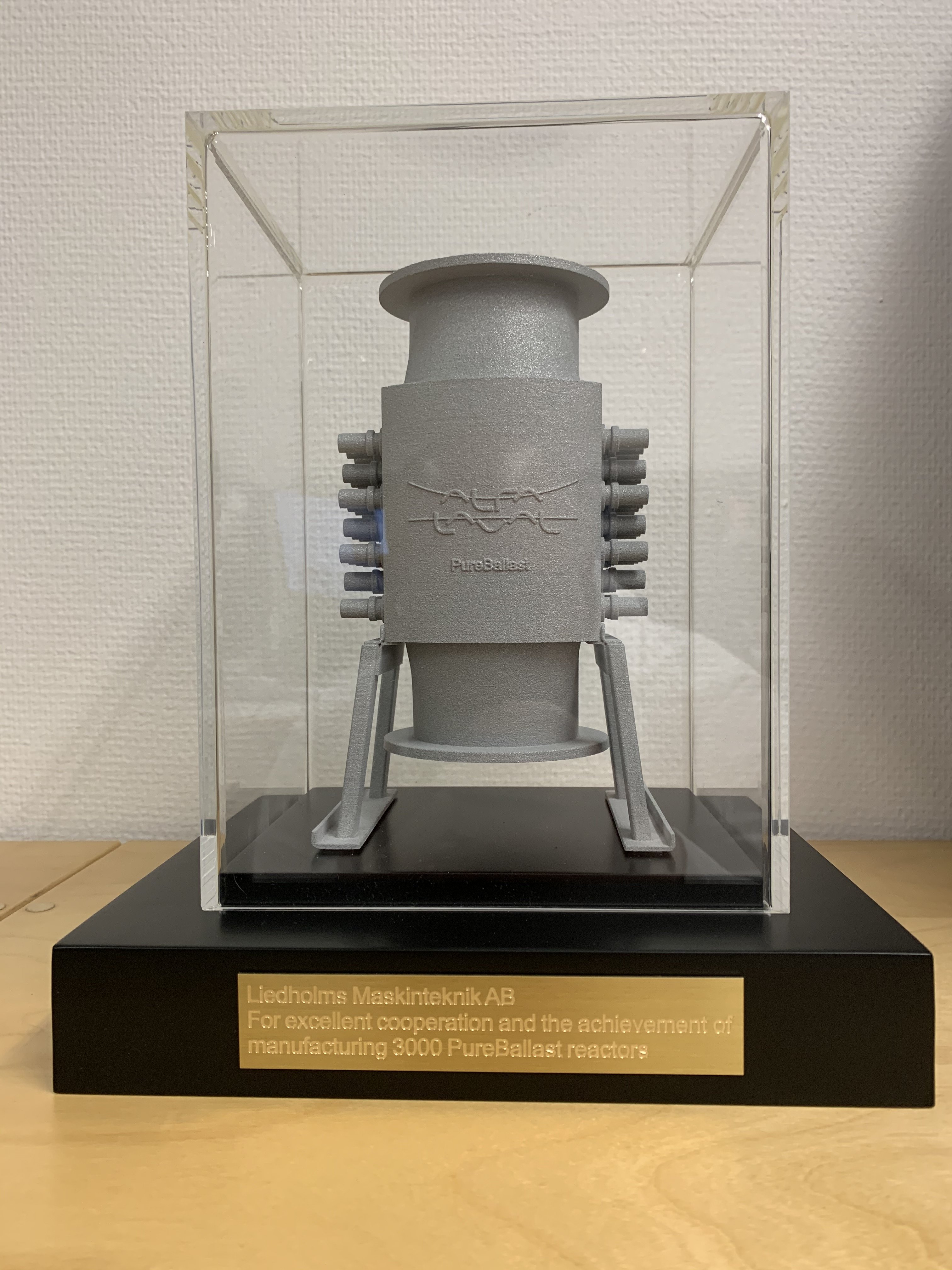 Yesterday we celebrated the delivery of our 3000th reactor to Alfa Laval and Alfa Laval surprised us with Peter Börjesson (VP Operations Global Purchasing) at the forefront when they showed their appreciation for our long and fruitful collaboration. It was with pride that we received a diploma and a 3D-printed mini-reactor with the text “For excellent cooperation and the achievement of manufacturing 3000 PureBallast reactors“.